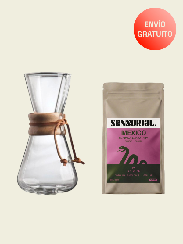 Get into the art of coffee preparation with our exclusive pack, which combines an innovative and highly functional Chemex coffee machine with specially selected roasted coffee to bring out the unique qualities of this method.